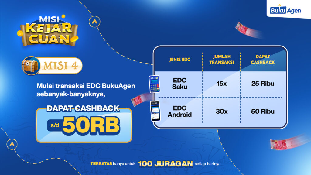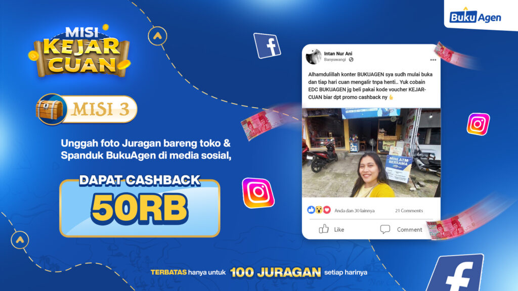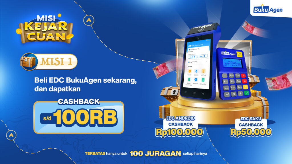 - Wajib mengajak orang lain untuk membeli EDC BukuAgen dengan kode voucher KEJARCUAN di keterangan/caption. Contoh: Alhamdulillah konter BukuAgen saya sudah mulai buka dan tiap hari cuan mengalir tanpa henti.. Yuk cobain EDC BukuAgen juga beli pakai kode voucher KEJARCUAN biar dapat promo cashback-nya 👍